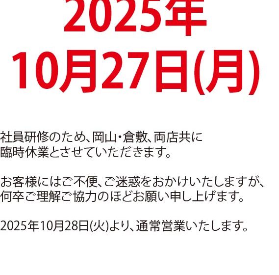 2025年10月27日(月)は社員研修のため、岡山、倉敷、両店ともに臨時休業とさせていただきます。