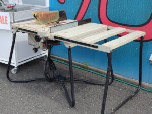 現場移動が簡単、折りたたみ・組み立てワンタッチ現場での型枠作りや造作作業に最適なマルノコ盤です。大きな製材に適しています。3月8日(土)、9日(日)の限定販売です。興味のある方は是非おいでください。